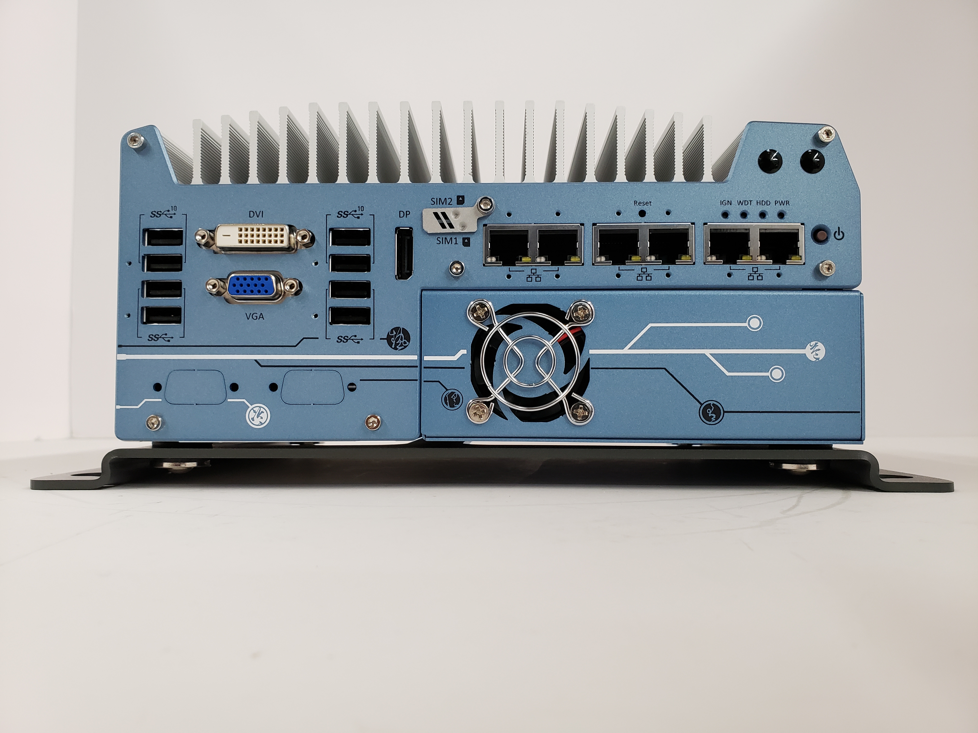 Intel® Coffee Lake 8th-Gen Core i7 Embedded Controller 6xGigE M.2 2280 M Key Socket (Gen3 x4) 8xUSB 3.1 VGA DVI DP Piggybacked 4xGigE Board Installed 2-Slot PCIe Cassette Installed |